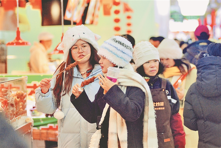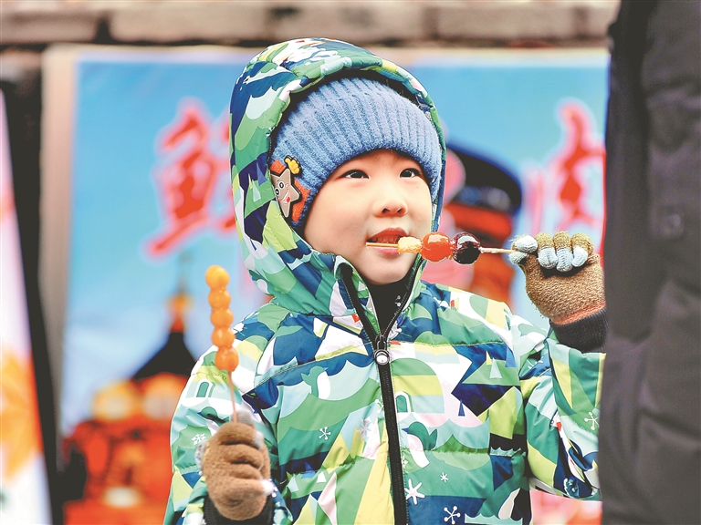 12月1日,哈爾濱市道外區(qū)南二道街附近,許多游客購買、品嘗美味的糖葫蘆。這些糖葫蘆有很多口味,包括山楂、葡萄、菠蘿、大棗、桔子、草莓等,有的還在里面添加了糯米、核桃等餡料。冬天,吃一串晶瑩剔透、甜里帶酸的糖葫蘆,絕對是一種享受。
