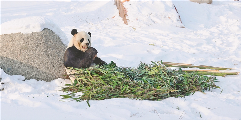 尤其是“佑佑”,曬著午后暖陽,坐在室外的雪地里,大口“狂炫”竹葉,這一口吃夠了,就尋覓著從雪里刨出來一根竹筍,秒變“剝筍小哥”。“佑佑”還時(shí)不時(shí)停下來,盯著人群定格幾秒,仿佛是專門為游客拍照擺好姿勢(shì),令不少南方小伙伴感嘆“開了眼界”。