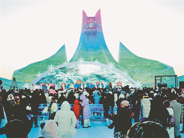 精美與靈動相互交織,園區(qū)內(nèi)亞冬會氛圍濃厚?!拔覀冊趫@區(qū)內(nèi)看到很多亞冬會元素的冰雪景觀,像雪雕‘濱濱’‘妮妮’、會徽大地景觀等,準(zhǔn)備逐個打卡?!鄙綎|游客許多開心地說。