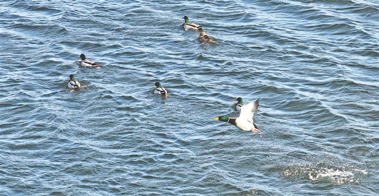 小野鴨融入湖中的一大群綠頭鴨,野鴨湖即將迎來(lái)春暖花開(kāi)的季節(jié)。本報(bào)記者 張澍攝