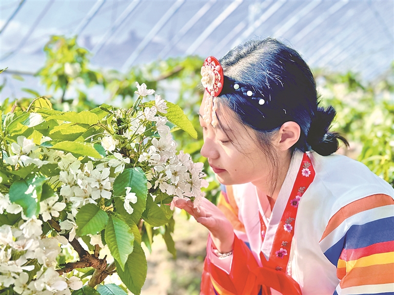 日前,湯原縣湯旺朝鮮族鄉(xiāng)大棚采摘園里櫻桃花大片盛開,吸引游客到此打卡拍照。據(jù)了解,該采摘園共有11棟大棚,種植1000余棵大櫻桃。櫻桃成熟后,果子個頭兒大,果肉厚實、硬度大,口感甜蜜,單體重量達到18克以上,年產量超7000斤,且耐儲存不易開裂,受到市場青睞。