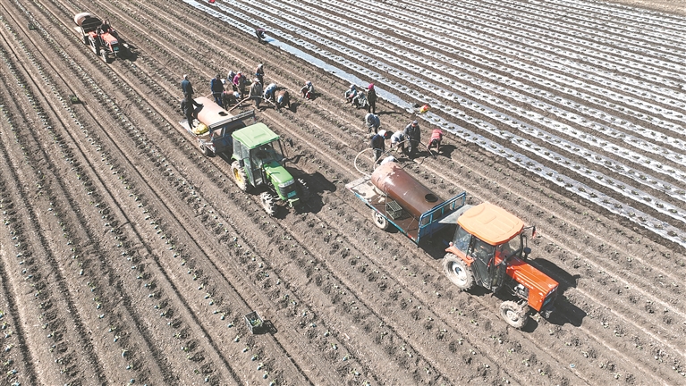 通往新華鄉(xiāng)的道路兩側(cè),儼然一幅動態(tài)的農(nóng)事畫卷:拖拉機“突突”作響,拉著水罐在田壟間穿梭;菜農(nóng)們分工默契,有人鋪設地膜,白色薄膜在黑土地上延展成浪;有人彎腰移栽,鮮嫩菜苗被小心植入土中;有人手持水管緊隨其后,清水汩汩滋潤著新苗。覆膜、栽苗、澆水,動作連貫流暢,田埂間回蕩著農(nóng)具與泥土的碰撞聲,交織成初夏最生動的勞作交響。