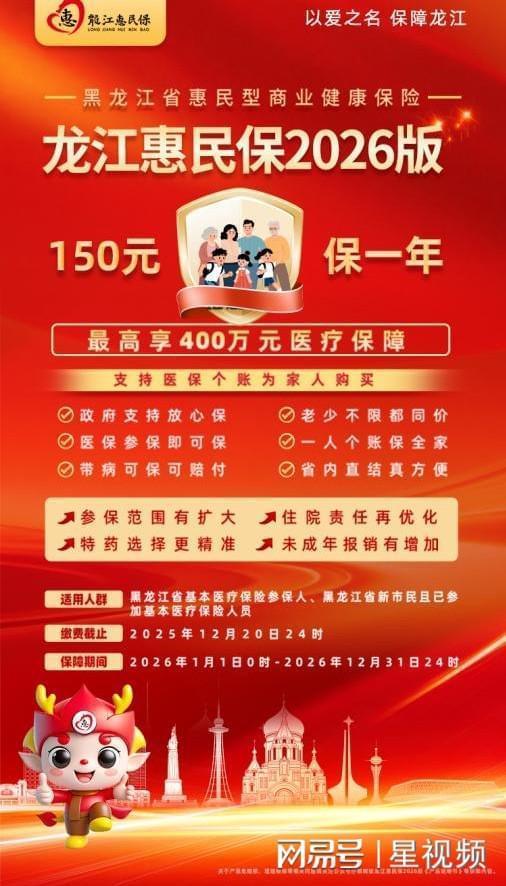 “龍江惠民保2026版”參保通道僅剩最后五天,將于2025年12月20日24時正式關(guān)閉。凡黑龍江省基本醫(yī)保參保人,只需通過“龍江惠民?!蔽⑿殴娞柤纯蓞⒈#咳嗣磕?50元,最高享400萬元醫(yī)療保障。