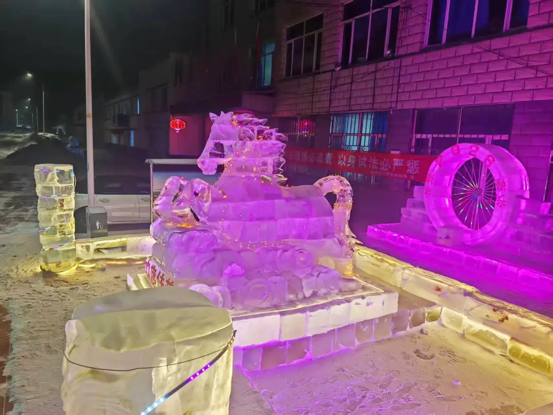 活動(dòng)現(xiàn)場(chǎng),專(zhuān)業(yè)技術(shù)工人憑借精湛技藝,專(zhuān)注勾勒駿馬整體輪廓,對(duì)眼部、鬃毛等關(guān)鍵部位精雕細(xì)琢,力求每一處細(xì)節(jié)都精準(zhǔn)靈動(dòng);林場(chǎng)干部職工則主動(dòng)扛起取冰、補(bǔ)冰、轉(zhuǎn)運(yùn)等“硬核”任務(wù),大家分工明確、默契配合,叮叮當(dāng)當(dāng)?shù)墓ぞ咔脫袈?、此起彼伏的互助吆喝聲,交織成冬日里最熱鬧的樂(lè)章。經(jīng)過(guò)十余天的奮戰(zhàn),一尊尊栩栩如生的冰雕驚艷亮相,并成為林場(chǎng)及周邊區(qū)域的“新春網(wǎng)紅地標(biāo)”,不少職工家屬、周邊群眾紛紛慕名而來(lái),拍照打卡、定格年味瞬間,歡聲笑語(yǔ)為林場(chǎng)增添了更多溫馨氛圍。