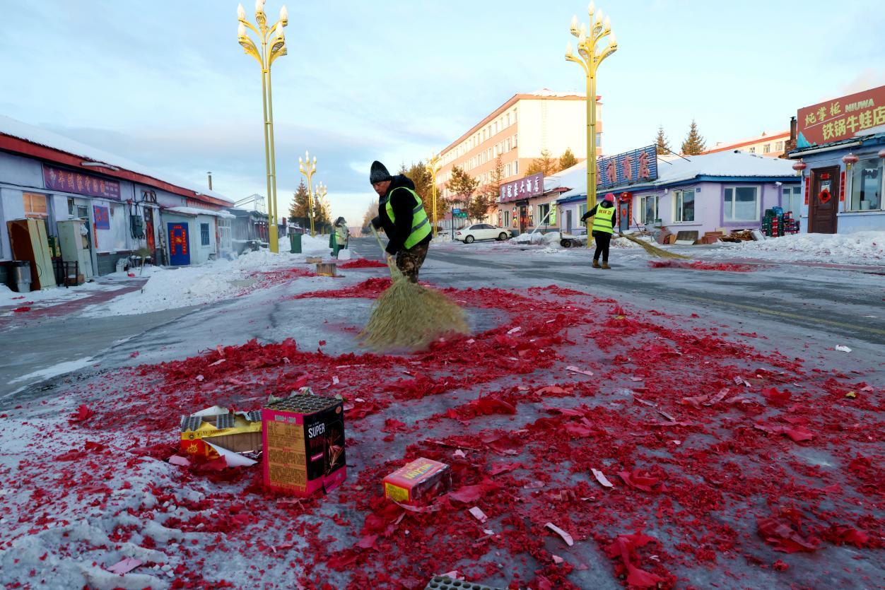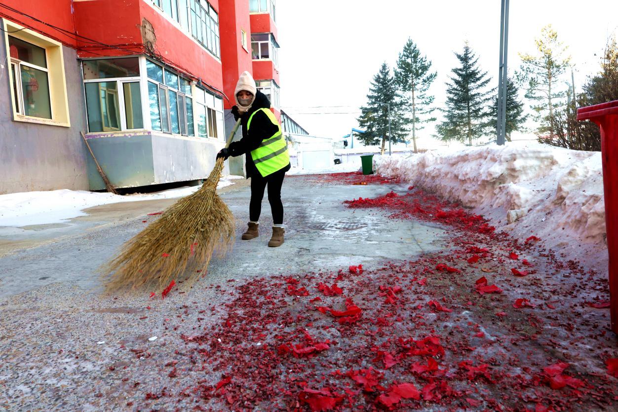 2月16日8點,大街小巷年味正濃,鞭炮紙屑散落各處,行人寥寥。身穿黃馬甲的林業(yè)局環(huán)衛(wèi)工人已穿梭在街頭,帽子、睫毛凝滿白霜,手中掃帚不停揮舞,將鞭炮碎屑、生活垃圾及時清掃歸堆、裝車清運(yùn)。轉(zhuǎn)崗環(huán)衛(wèi)工人馬建民說:“我的責(zé)任區(qū)內(nèi)商戶多、居民多,春節(jié)期間工作量比平時多一倍,必須打掃干凈,讓大家過個舒心年?!痹谌w保潔員的奮戰(zhàn)下,居民區(qū)實現(xiàn)鞭炮紙屑隨放隨清、生活垃圾日產(chǎn)日清,大街小巷始終整潔有序。