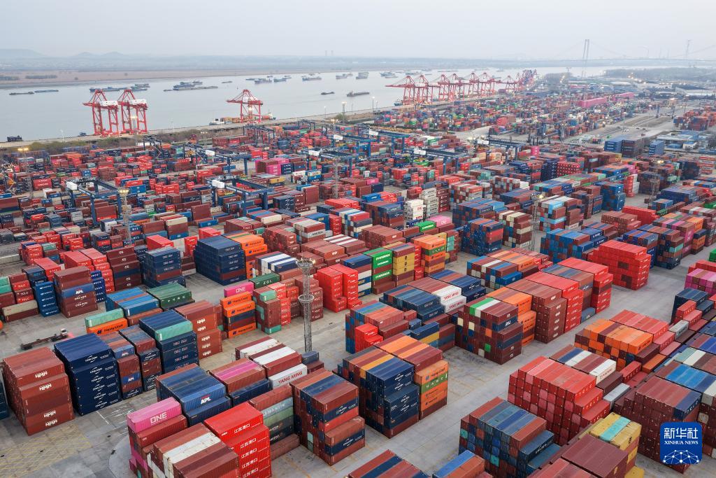 ??3月10日拍攝的江蘇省港口集團(tuán)南京港龍?zhí)都b箱碼頭(無(wú)人機(jī)照片)。新華社發(fā)(方東旭攝)